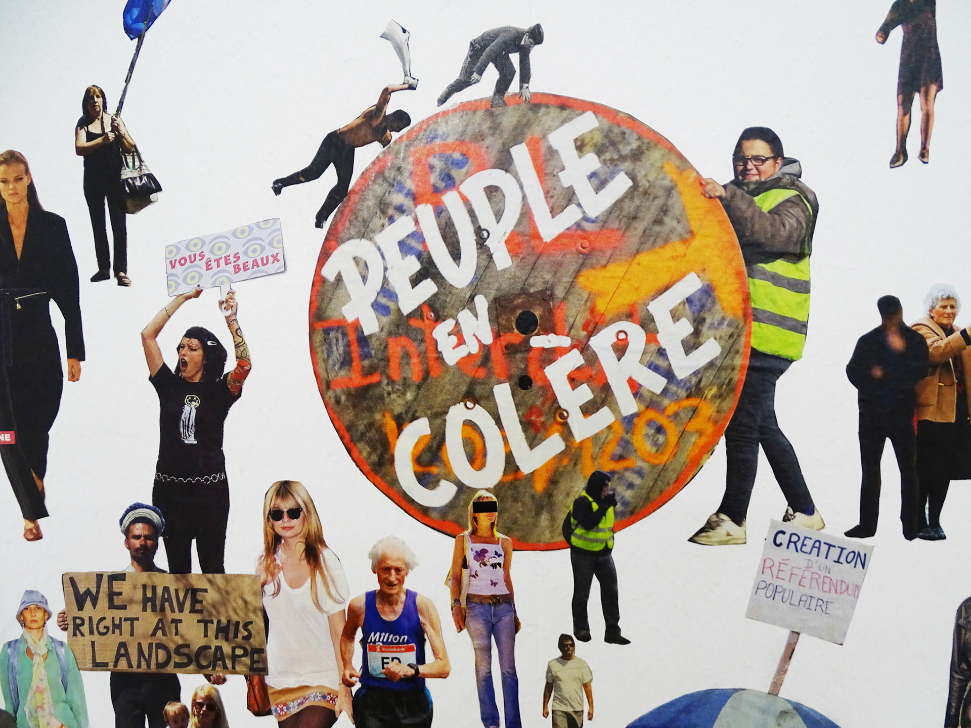 Chaque figure est ensuite confrontée à d’autres, encollées entre elles ou à même le mur, au sein de compositions interrogeant les tendances médiatiques (Coupures de Presse #1, Maillon Femme), les formes (Trois cent soixante et onze personnes rassemblées dans un mètre carré), les couleurs (Transit)…